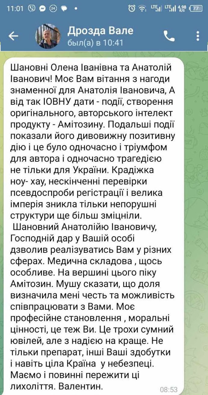 В нашій країні дуже багато людей потребують лікування. І їх життя можливо врятувати. 65 років, як існує амітозин, а в нашій країні в нього досі не вірять. Хоча він врятував багато життів, і прикладом є я також. І скільки таких життів ще ж можна врятувати. Хочеться вірити, що багаторічна праця Анатолія Івановича буде визнаною нашими чиновниками. А я прошу Господа Бога здоров’я Анатолію Івановичу і довгих літ щасливого життя.