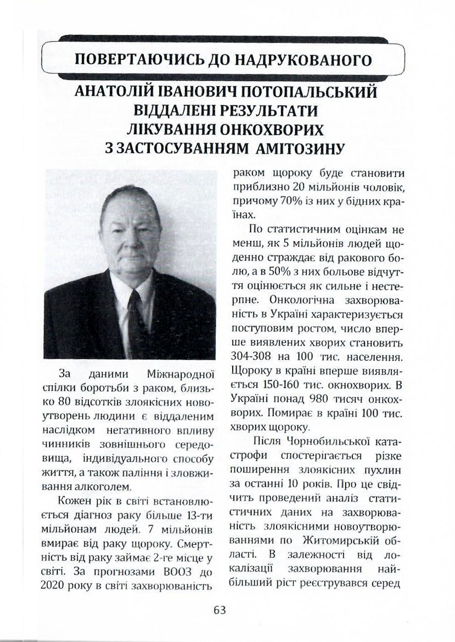 Анатолій Іванович ПОТОПАЛЬСЬКИЙ — наш учений-сучасник. Розробки Анатолія Івановича можуть бути корисними і в так звану “добу тероризму”, і при воєнній агресії, коли застосовується хімічна й бактеріологічна зброя. Неймовірно, але ось уже майже 45 років винаходи вченого не “пускають у народ”, хоча ще з 60-х років минулого століття Анатолія Івановича із засекреченими антипухлинними ліками не раз у надзвичайному режимі доставляли